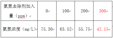 小结:从处理结果可知,氨氮在投加量300ppm(每吨废水加0.3kg的氨氮去除剂)就可以将氨氮控制