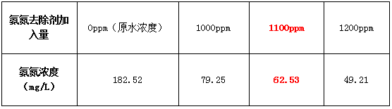 实验结果显示,在沉淀池中投加氨氮去除剂,当投加量达到1100ppm(即每吨废水加1.1kg的氨氮去除剂)时,氨氮浓度可稳定控制在50mg/L以下。此外,该药剂反应迅速,仅需3~4分钟即可见效,且无需增加额外的设备和工艺,为园区污水处理提供了有效的解决方案。